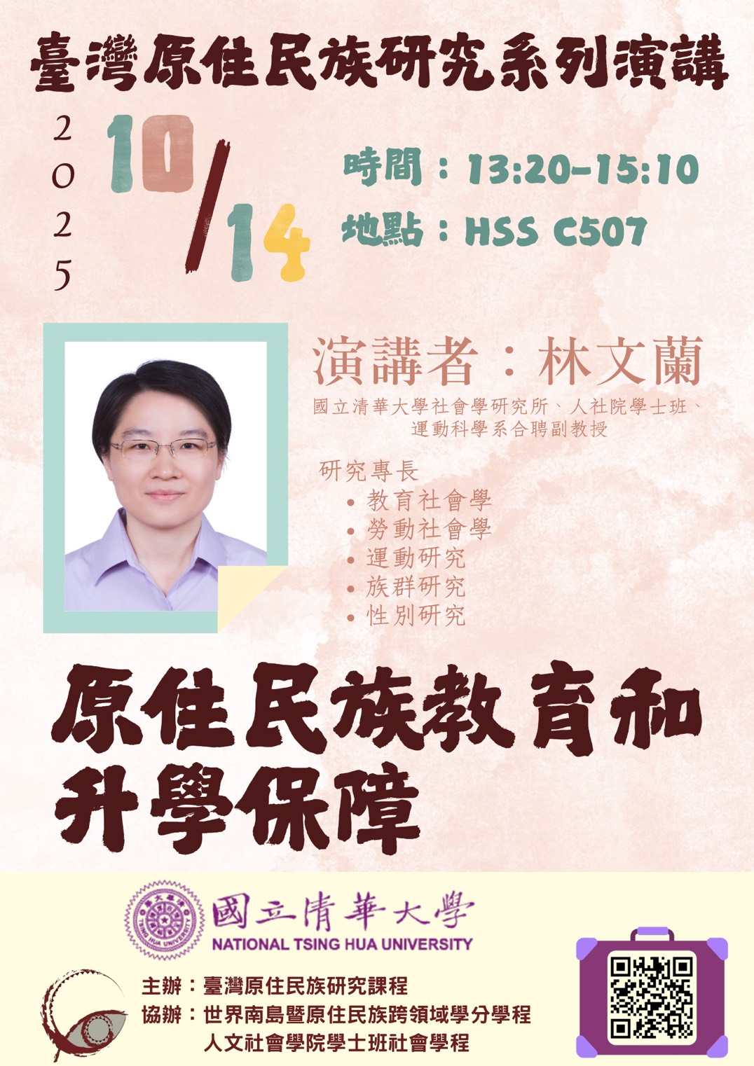 【演講】人社院學士班臺灣原住民族研究系列演講「原住民族教育和升學保障」:10/14(二)13:20