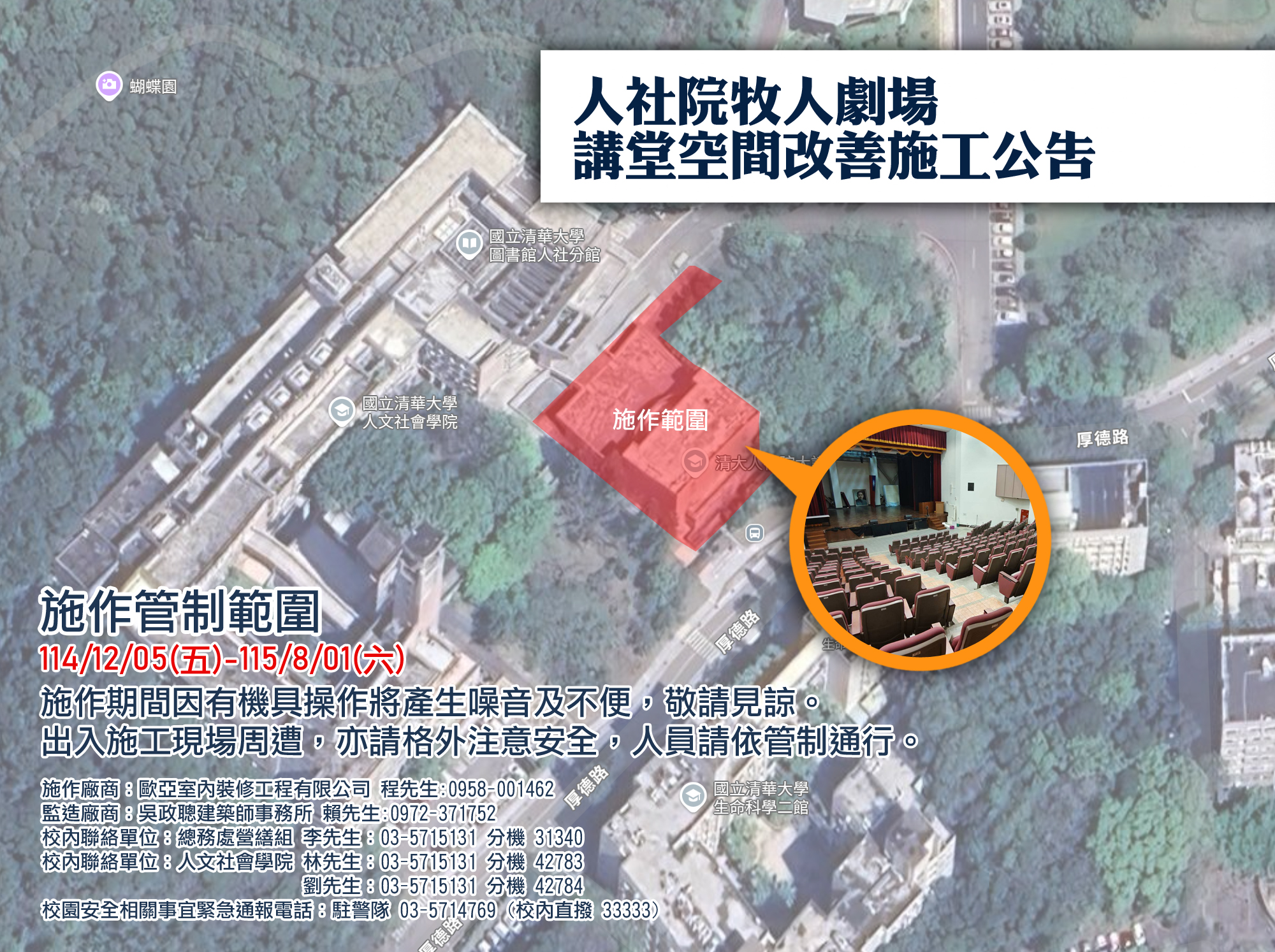 【公告】人社院牧人劇場講堂空間改善施工公告:114/12/5(五)-115/08/01(六)