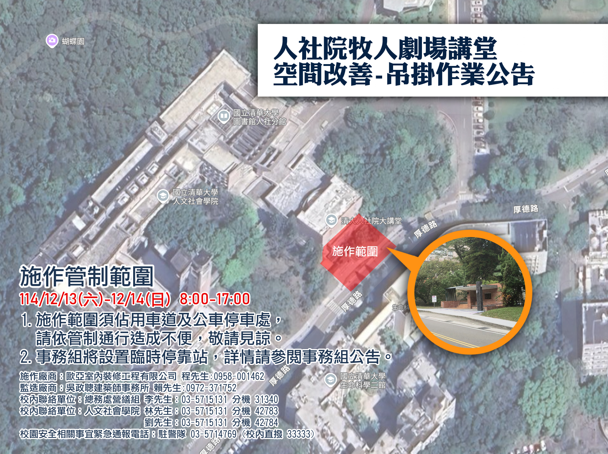 【公告】人社院牧人劇場講堂空間改善-吊掛作業:114/12/13(六)-12/14(日) 8:00-17:00