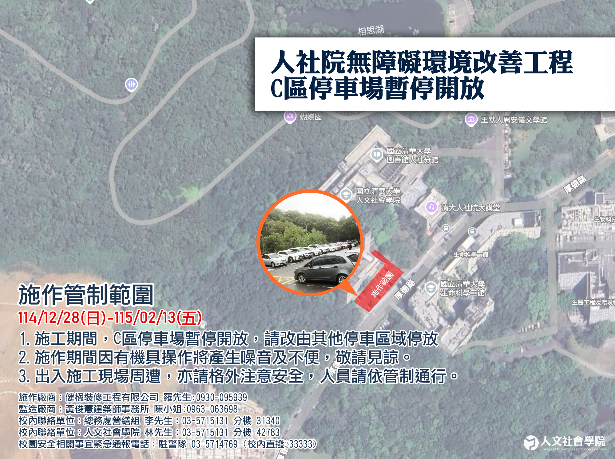 【公告】人社院無障礙環境改善工程-C區停車場暫停開放:114/12/28(日)~115/02/13(五)