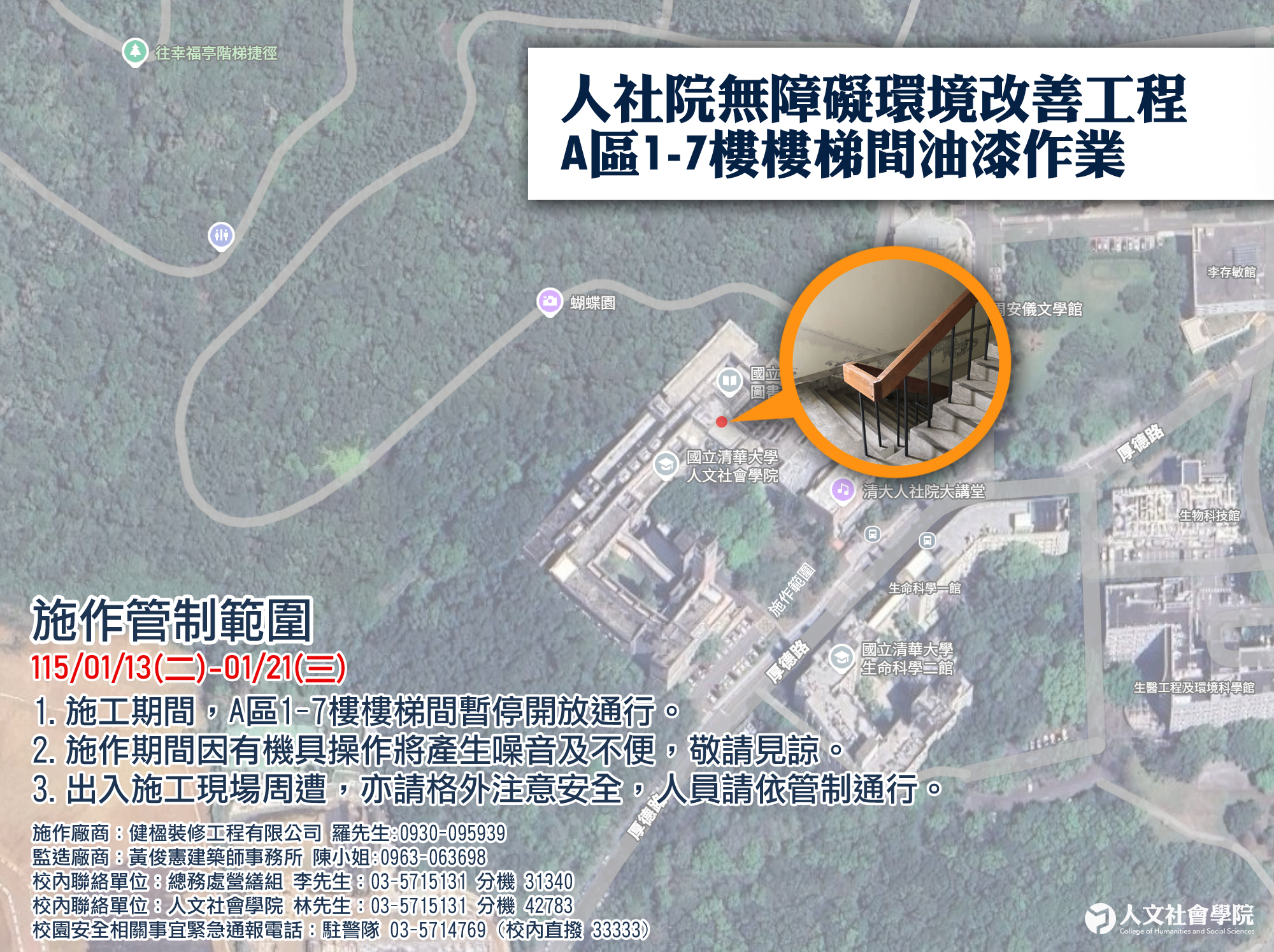 【公告】人社院無障礙環境改善工程-A區樓梯間油漆作業:01/13(二)~01/21(三)