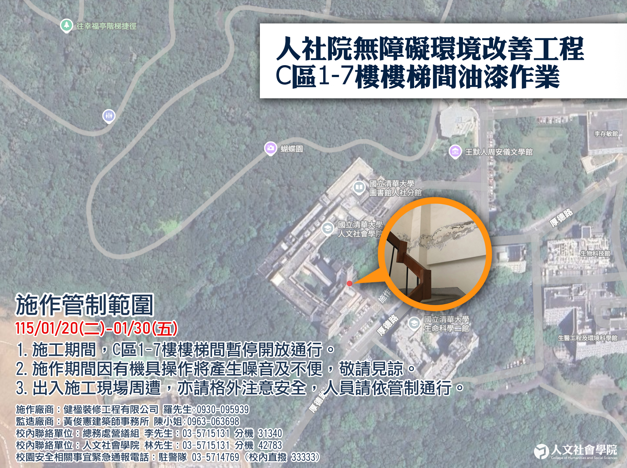 【公告】人社院無障礙環境改善工程-C區樓梯間油漆作業:01/20(二)~01/30(五)