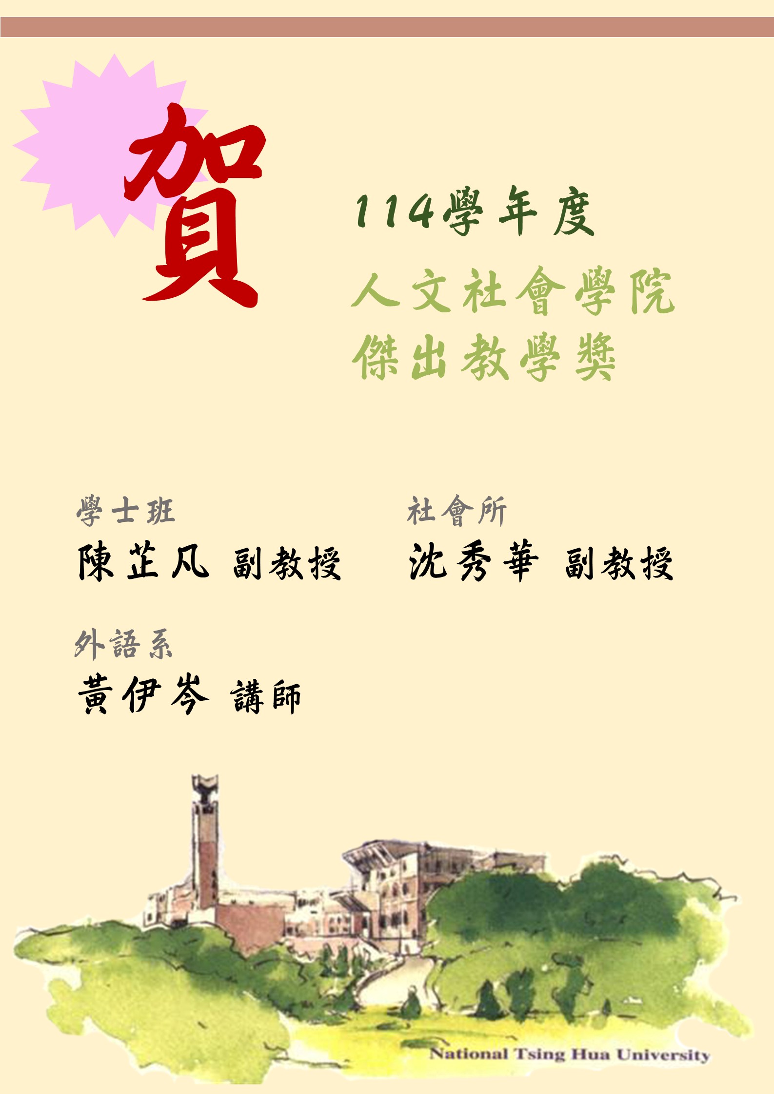 【公告】賀學士班陳芷凡副教授、社會所沈秀華副教授、外語系黃伊岑講師榮獲「114學年度人社院教師傑出教學獎」