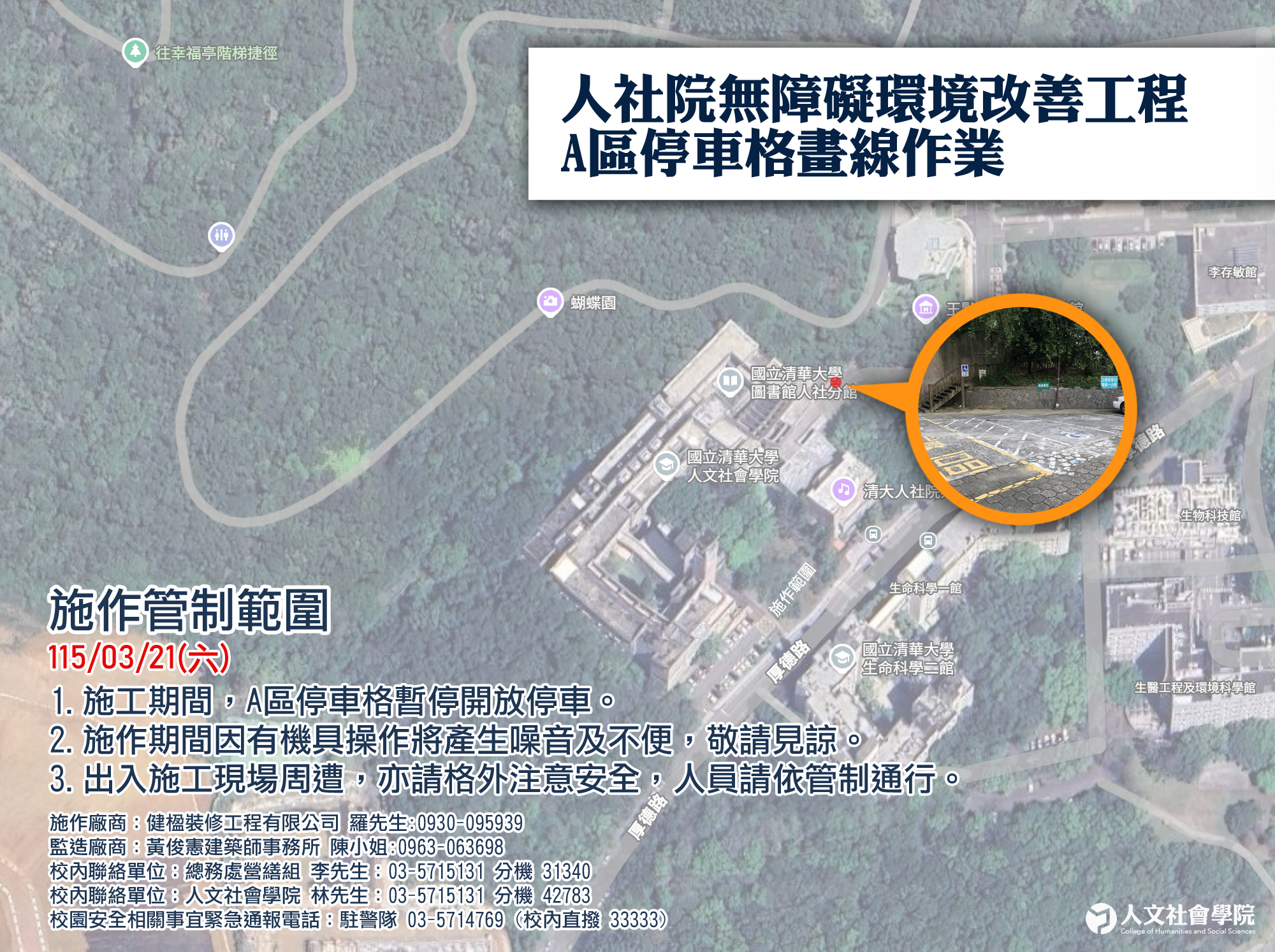 【公告】人社院無障礙環境改善工程-A區停車格畫線作業:115/03/21(六)