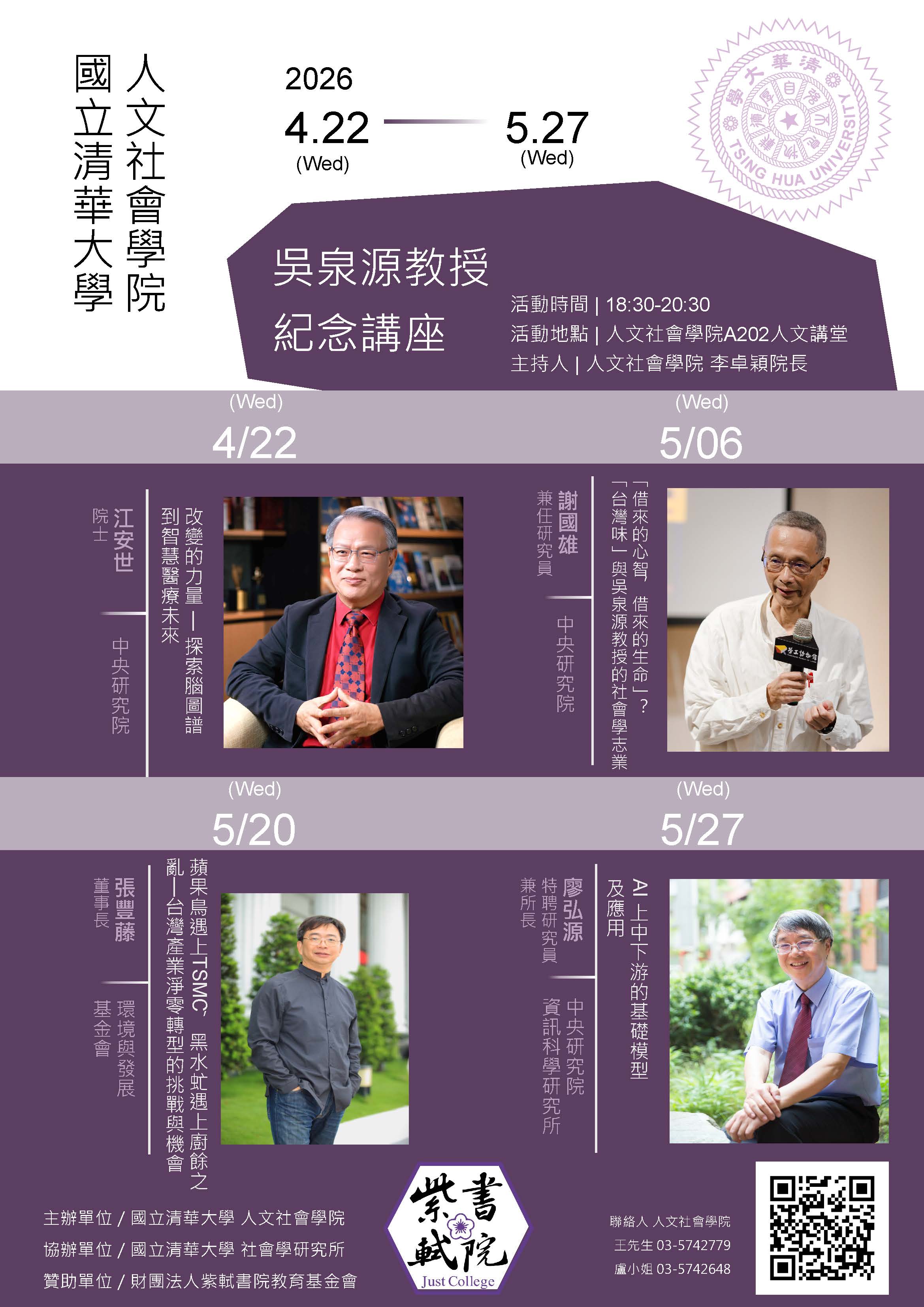 【演講】紫軾書院「國立清華大學人文社會學院吳泉源教授紀念講座」:04/22-05/27
