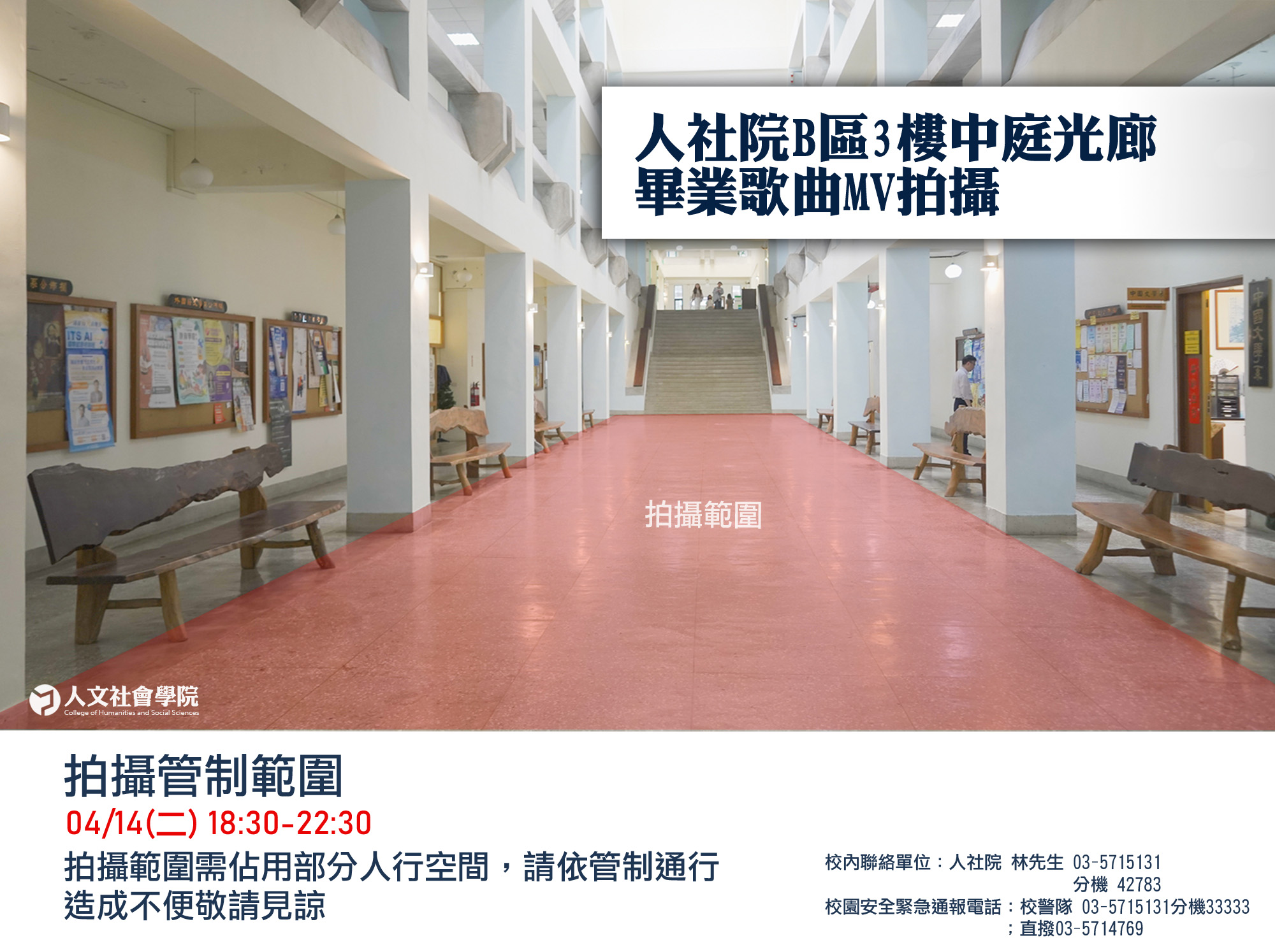 【公告】人社院B區3樓中庭光廊課外組畢業歌曲MV拍攝:04/14(二) 18:30-22:30
