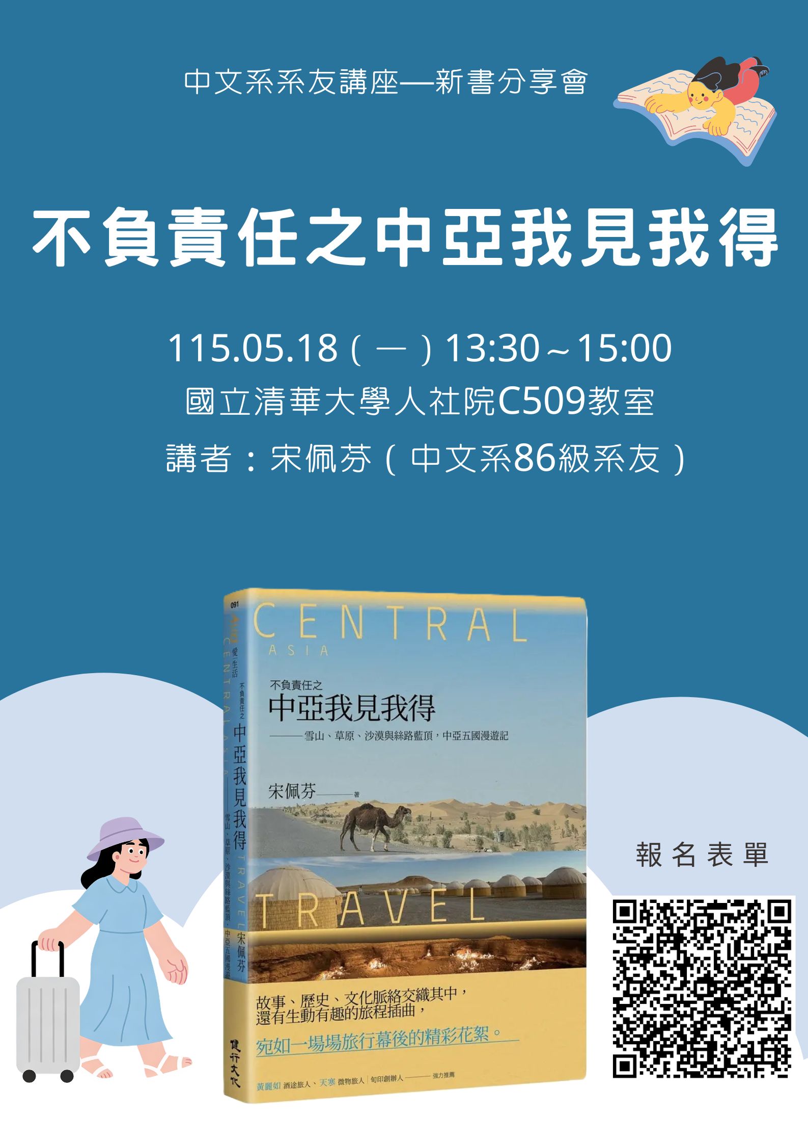 【演講】中文系系友講座新書分享:《不負責任之中亞我見我得:雪山、草原、沙漠與絲路藍頂,中亞五國漫遊記》:5/18(一)13:30